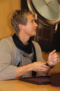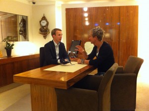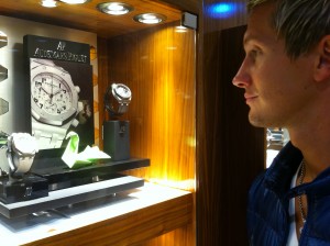 Avtalen er kommet i stand gjennom urmaker Bjerke i Oslo. Her sitter jeg på butikken deres på Karl Johans gate i Oslo sammen med Aleksander Bjerke Opsahl og ser på en Audemars Piguet klokke.